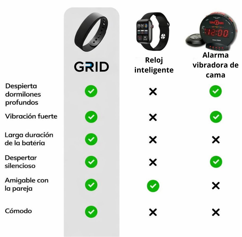 GRID Watch te despierta con vibración directa en la muñeca. Potente para vos. Silenciosa para todos los demás.