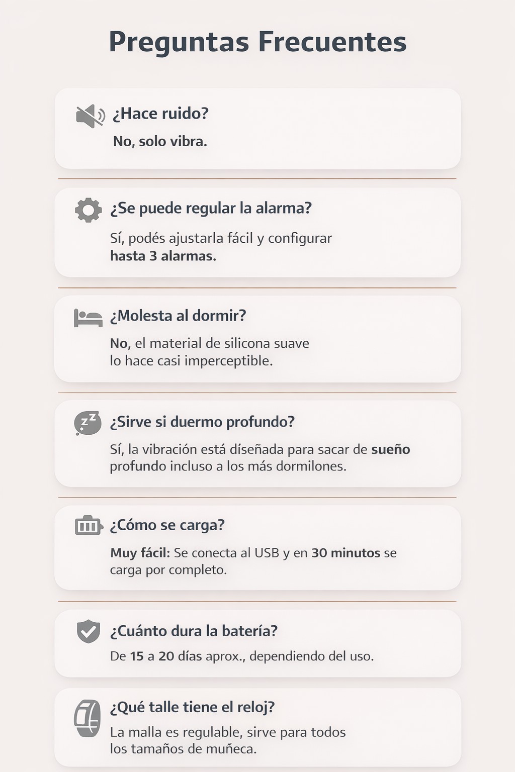 No más alarmas que despiertan a tu pareja. No más relojes que vibran tan suave que los apagás dormido. No más depender de alguien para llegar a tiempo.